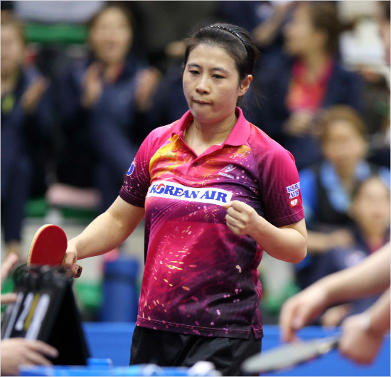 '나 아직 안 죽었어!' 김경아가 1일 포스코에너지컵 실업탁구대회 여자 단체전 결승에서 득점에 성공한 뒤 주먹을 불끈 쥐는 모습.(영주=월간 탁구)