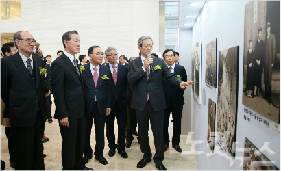 전경련은 3일 전경련회관 1층 로비에서 허창수 전경련 회장, 이홍구 전 국무총리, 정홍원 기념사업위원장, 정몽준 아산재단 이사장 등 전경련 임직원 100여명이 참석한 가운데 '정주영 탄신 100주년 사진전'을 개최, 정몽준 아산재단 이사장이 가족사진에 대한 설명을 하고 있다.