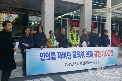 ◇ "날치기에 가까운 폭거" = 전교조 대전지부는 이 날 대전시의회 앞에서 기자회견을 열고 의회의 결정을 '민의를 저버린 날치기에 가까운 폭거'라고 규정했다.