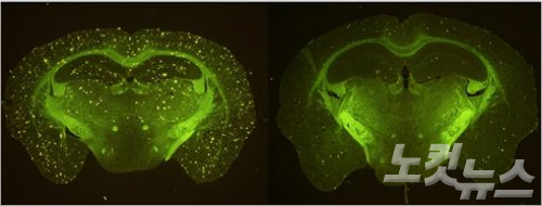신약후보물질(EPPS)에 의한 알츠하이머병 치료(원인물질제거) 효과, 치매 생쥐 뇌(왼쪽), EPPS 경구 투여 후 치매 생쥐 뇌(우) 알츠하이머병이 유발된 생쥐 모델에 EPPS를 물에 타서 3개월 간 먹인 결과 병을 유발하는 베타아밀로이드 응집체가 뇌에서 거의 사라졌다. (사진=KIST 제공)