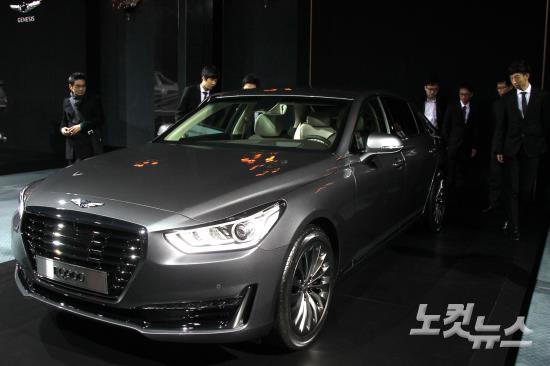 9일 오전 서울 용산구 그랜드하얏트서울 호텔에서 현대자동차의 대형 세단 '제네시스 EQ900'이 공개되고 있다. EQ900의 파워트레인은 람다 3.3 V6 터보 엔진을 포함해 람다 3.8 V6 엔진, 타우 5.0 V8 엔진 등 세가지로 출시된다.