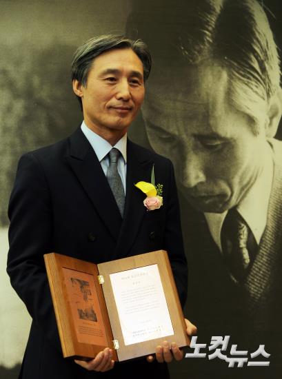 ‘제14회 송건호언론상’을 수상한 CBS 변상욱 대기자가 9일 오후 서울 세종로 프레스센터에서 열린 시상식에서 기념촬영을 하고 있다.