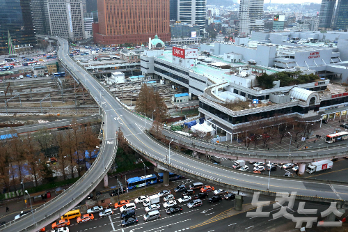 오전 10시 현재 염천교 주변 일부 구간이나 삼각지역에서 남대문경찰서 방향 한강대로에 있는 차량은 시속 10km 미만의 속력을 내고 있다.