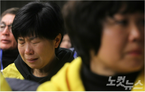 14일 오전 서울 명동 YWCA 대강당에서 열린 ‘4.16 세월호 참사 특별조사위원회 제1차 청문회’ 에 참석한 유가족들이 사고 당일 영상을 보며 눈물을 흘리고 있다. (사진=황진환 기자)