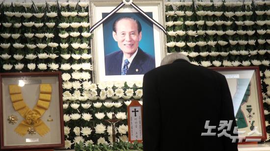 15일 오전 서울 서대문구 신촌세브란스병원 장례식장에 마련된 고(故) 이만섭 전 국회의장의 빈소를 찾은 조문객이 목례하고 있다.