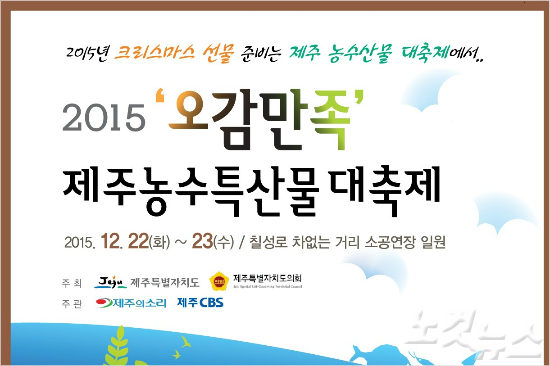 제주도는 12월 22~23일 이틀간 제주시 칠성로 차 없는 거리 소공연장 일원에서 청정 제주의 농·수·축산물과 특산물을 전시, 홍보, 판매하는 ‘2015 오감만족 제주 농수특산물 대축제’를 개최한다. 행사는 제주CBS와 제주의소리가 주관한다.
