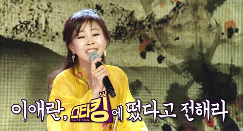 ◇ 김현정> 지난 주말에 제가 공중파 TV 보니까 제가 주말 예능 프로그램에 이애란 씨가 나오셨는데 눈물을 글썽거리서더라고요. 그거 왜 그러셨어요?