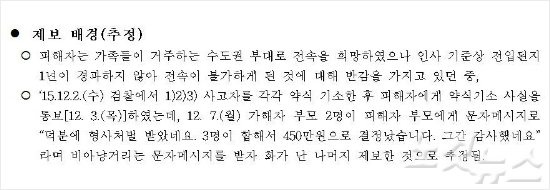 인권센터는 또 "이 문건에는 '피해자가 상습폭행에 대해 헌병 조사에서 진술하지 않았고, 성추행은 사안이 경미해 징계처리로 끝낼 방침'이라고 무책임하게 적혀 있다"며 "이는 명백한 직무유기"라고 주장했다.