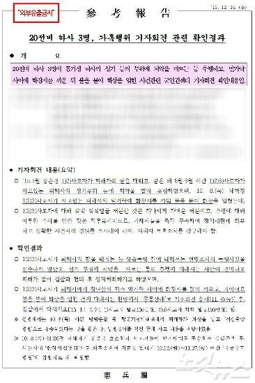 22일 공군 등에 따르면, 공군 헌병대는 지난 16일 '20전비(제20전투비행단) 하사 3명, 가혹 행위 기자회견 관련 확인 결과'라는 제목의 문건을 전 부대 수사담당자들에게 보냈다.