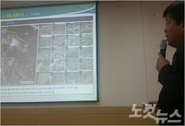 공주대 산학협력단 이찬희 책임연구원이 29일 공주 복합문화예술센터에서 지난 2013년 무너져 내린 공산성 성벽 붕괴 원인 등 정밀조사 결과를 발표하고 있다. (사진=고형석 기자)