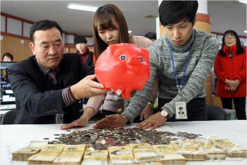 전북 전주 얼굴없는 천사가 30일 오전 9시 50분쯤 전주 노송동 주민센터에 소년소녀가장을 위해 써달라며 남기고 간 5만원권 지폐와 돼지저금통 등을 주민센터 직원들이 확인하고 있다. (사진=임상훈 기자)