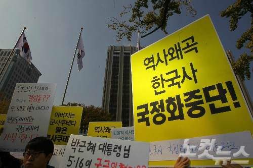 공교육살리기 교장연합과 바른교육 교사연합 등 보수단체 소속 교장·교사 등 1천명은 지난해 9월 25일 서울 광화문 광장에서 기자회견을 열고, "현행 검인정 한국사 교과서는 '대한민국의 역사교과서'가 아니"라며 한국사 교과서의 국정화를 요구하는 시국선언을 했다.