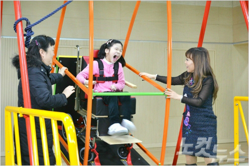 푸르메재활센터에 다니는 김소정 양이 성악가 조수미가 기부한 ‘휠체어 그네’를 타며 활짝 웃고 있다. (사진=푸르메재단 제공)