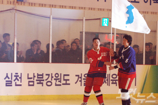 2006년 3월 3일 강원도 춘천의암빙상장에서 열린 남북 아이스하키 친선경기 개회식에서 북측대표 리금송(왼쪽.우리팀)과 남측대표 표장원(하나팀)이 대형 한반도기를 흔들고 있다.(사진= 자료사진)