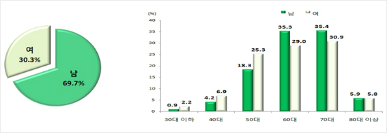 연령별로는 전체 폐암 환자의 87.8%가 50대~70대였다. 특히 남성은 60대와 70대가 각각 35%를 넘었고, 여성은 70대가 30.9%였다.