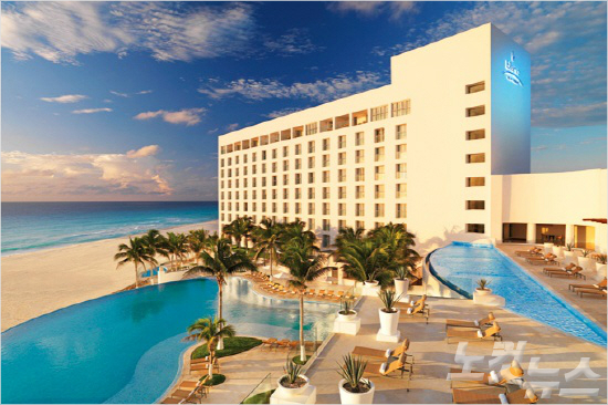 눈부시게 맑은 하늘과 바다사이에 위치한 칸쿤 르블랑 리조트의 외관. (사진=허니문리조트 제공)
