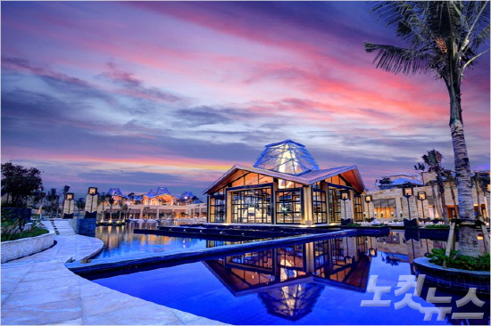 발리의 아름다운 석양과 함께 여유롭게 수영을 즐길 수 있도록 설계된 물리아 리조트 전경. (사진=허니문리조트 제공)