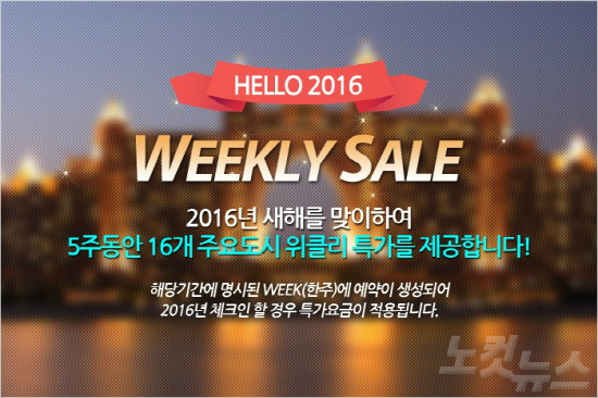 땡처리닷컴이 2016년 새해를 맞이해 이달부터 '헬로 2016 위클리 세일' 이벤트를 진행한다. 5주 동안 16개의 주요 도시의 호텔들을 특가에 제공한다.