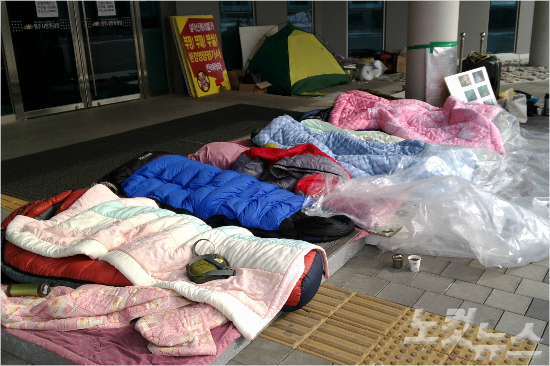겨울을 버텨내는 침낭과 비닐 한 조각, 2014년 원주 혁신도시에 신축한 원주지방환경청의 깔끔한 외관과 대비된다.