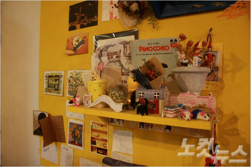 실제로 가지런히 배치 된 예쁜 책들과 벽 한 켠에 자리잡은 작가의 작품은 전시회나 일러스트레이터의 작업실에 들어온 듯한 느낌을 줬다.