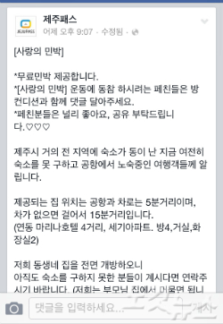 페이스북 제주패스에도 24일 저녁 늦게 '사랑의 민박'이라는 제목의 글이 올라왔다. 이 글은 2,986회 좋아요를 받고, 댓글이 230개가 달렸다.
