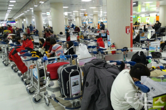 폭설과 한파로 제주공항 항공기 운항이 전면 중단된 가운데 체류객을 위해 익명의 시민이 간식을 제공하는 등 미담도 늘고 있다.