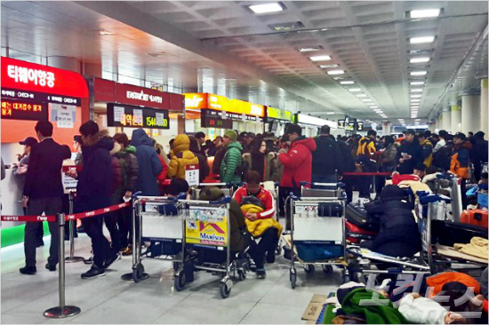 제주도에 사흘째 폭설이 쏟아지면서 제주공항에 내려진 운항통제 조치로 항공기가 무더기 결항되면서 25일 고립된 항공 이용객들이 운항정보를 확인하기 위해 항공사 부스에 몰려들고 있다. (사진=곽인숙 기자)