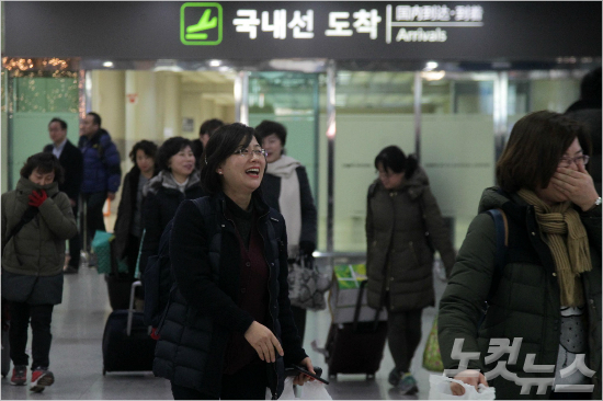 32년 만에 폭설로 폐쇄된 제주국제공항의 항공기 운항이 재개된 25일 오후 제주도에 고립됐던 여행객들이 서울 김포공항에 도착하고 있다. (사진=박종민 기자)