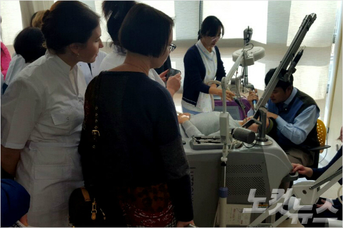 러시아 의료진이 애양병원의 레이저 치료를 바라보고 있다. (사진 = 전남CBS 김유리 아나운서)