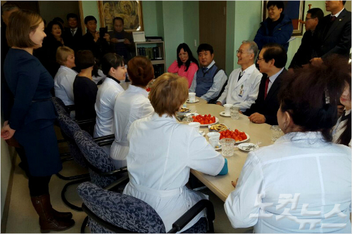 러시아 의료진과 애양병원 김인권 원장이 함께 대화를 나누고 있다. (사진 = 전남CBS 김유리 아나운서)