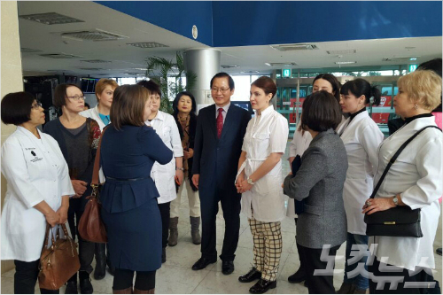 러시아 의료진이 애양병원을 둘러보며 설명을 듣고 있다.(사진 = 전남CBS 김유리 아나운서)