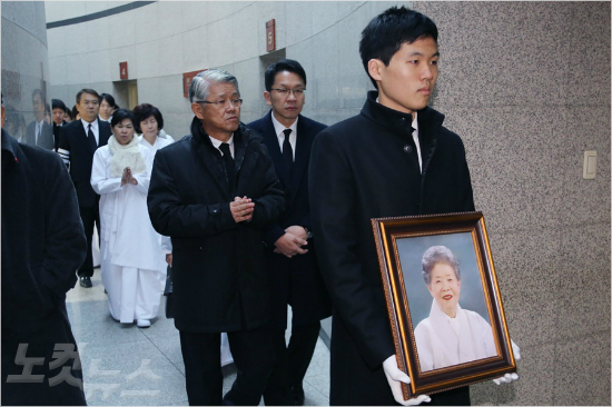 31일 오후 수원시 연화장에서 최신원 SKC회장(영정 뒤 왼쪽)과 최창원 SK케미칼 부회장(최 회장의 왼쪽)이 모친인 고 노순애 여사의 영정을 앞세우고 유족들과 함께 승화원으로 들어서고 있다. (사진=SK그룹 제공)