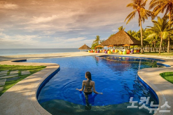 하늘과 바다를 한 몸에 안으며 수영을 즐길 수 있는 사우스팜 리조트의 풀. (사진=온필 제공)