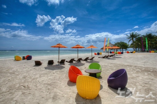 알록달록한 의자가 인상적인 필리핀 보홀 사우스팜 리조트의 비치 바. (사진=온필 제공)
