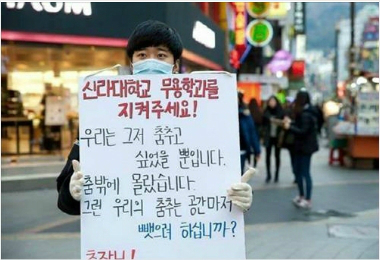 신라대 무용학과 학생이 거리에서 학과존속을 호소하는 피켓시위를 벌이고 있다. (사진=신라대 무용학과 제공)
