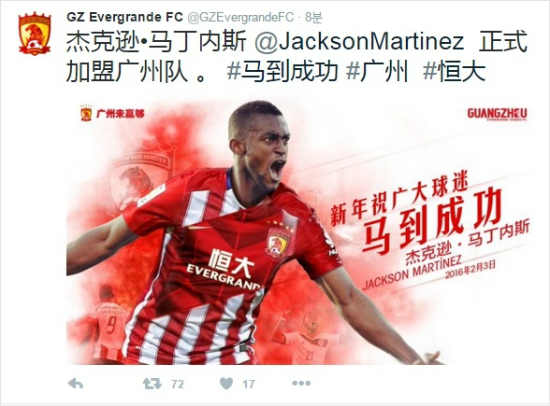 중국 슈퍼리그 광저우 헝다는 스페인 프리메라리가 아틀레티코 마드리드에서 활약하던 콜롬비아 국가대표 공격수 잭슨 마르티네스를 영입했다.(자료사진=광저우 공식 트위터)