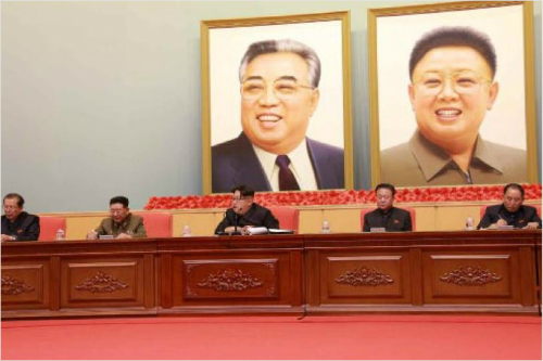 북한 노동당 중앙위 인민군위원회 연합확대회의에 사복을 입고 등장한 김영철 통전부장(오른쪽)(사진=노동신문)