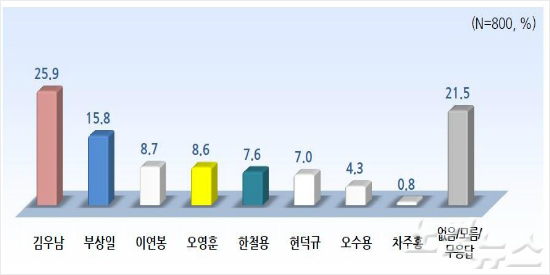 선호도 조사에서 김우남 의원은 25.9%의 지지를 얻었다. 부상일 전 새누리당 제주도당위원장은 15.8%로 2위였다.