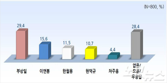 새누리당의 경우 부상일 후보의 선호도는 29.4%로 15.6%의 이연봉 후보를 따돌렸고 한철용 후보 11.5%, 현덕규 후보 10.7%, 차주홍 후보 4.4% 순이었다. 지지후보가 없는 태도 유보층은 28.4%로 나타났다.