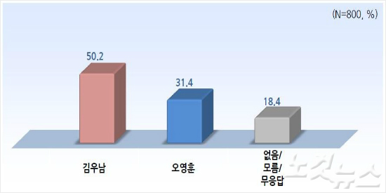 더불어민주당은 김우남 후보가 50.2%의 선호도를 보여 31.4%의 오영훈 후보와는 18.8%P차이가 났다. 태도 유보층은 18.4%였다.