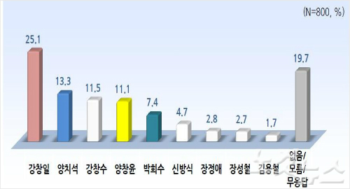 모두 5명이 등록을 마친 가운데 이번 여론조사에서 새누리당에서는 양치석 전 제주도 농축산식품국장(20.5%) 양창윤 전 제주국제자유도시개발센터 본부장(19.8%), 강창수 전 도의원(18.9%) 순이지만 3명은 오차범위 내에서 팽팽했다.