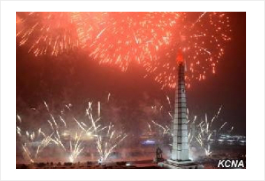 저녁 주체사상탑이 솟아있는 대동강변을 중심으로 김일성광장과 만수대언덕, 옥류교 등 수도의 곳곳은 환희의 축포가 터져오를 순간을 기다리는 인민군장병들과 각계층 근로자들,청소년학생들로 인산인해를 이뤘다고 통신은 전했다.