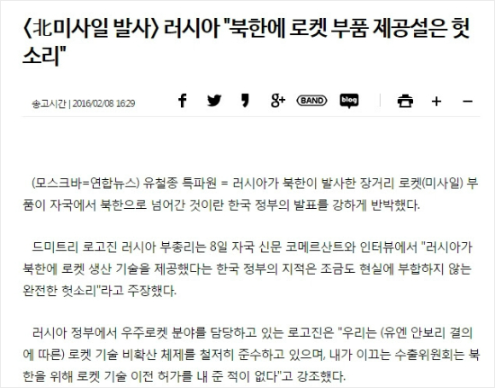 연합뉴스는 <러시아 “북한에 로켓 부품 제공설은 헛소리”>(2/8 16:29 http://me2.do/5Cd2i5Y5)기사의 경우 9일 오전 8시에도 국제면이나 홈페이지 초기 화면 등에 게재하지 않아 검색란에서 검색해야 기사를 확인할 수 있다. 이 기사는 국정원이 지난 7일 북한의 장거리 로켓 발사 직후 긴급 소집된 국회 정보위원회 전체회의에서 북한이 발사한 로켓의 주요 부품을 대부분 러시아에서 도입한 것으로 보인다고 보고하자 러시아가 강하게 반박한 내용이다. 드미트리 로고진 러시아 부총리는 8일 자국 신문 코메르산트와 인터뷰에서 “러시아가 북한에 로켓 생산 기술을 제공했다는 한국 정부의 지적은 조금도 현실에 부합하지 않는 완전한 헛소리”라고 주장했다. 국정원이 북한 로켓 발사와 관련해 헛발질을 한 것이다. 국정원의 이런 주장은 국정원 1.2 차장이 적격 경질된 뒤 나온 것이다.