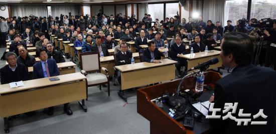 12일 오전 서울 여의도 중소기업중앙회 대회의실에서 열린 개성공단 기업협회 비상총회에 참석한 정기섭 협회장이 모두발언을 하고 있다.