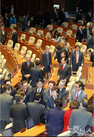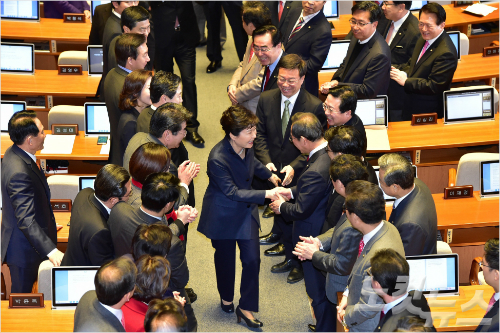새누리당 의원들은 연설이 끝난 뒤에는 중앙 통로 양옆에 도열해 박 대통령에게 악수 세례를 퍼부었다.
