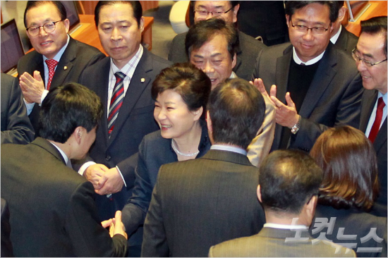 박근혜 대통령이 16일 오전 국회 본회의에서 북 핵ㆍ미사일 위협 및 쟁점법안 등과 관련 국정에 관한 국회 연설을 마치고 의원들과 인사를 하고 있다. (사진=윤창원 기자)