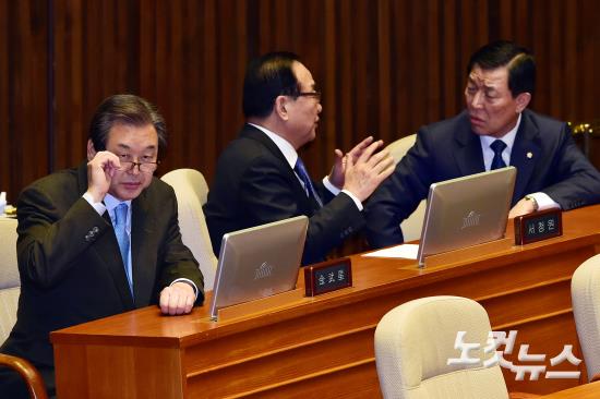 18일 국회 본회의에서 안경을 만지고 있는 새누리당 (좌측부터)김무성 대표 옆으로 서청원 최고위원과 황진하 사무총장이 이야기를 하고 있다. 김 대표와 서 최고위원은 이날 오전 당 최고위에서 공천룰과 관련 언쟁을 벌였다,