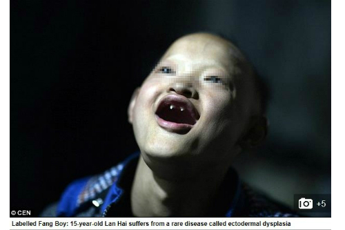 중국 충칭에 거주하는 15세 소년 란 하이는 태어날 때부터 이가 두 개밖에 없었다. 머리 숱도 드물다. 유전질환인 '외배엽 형성이상'(Ectodermal dysplasia) 때문이다.