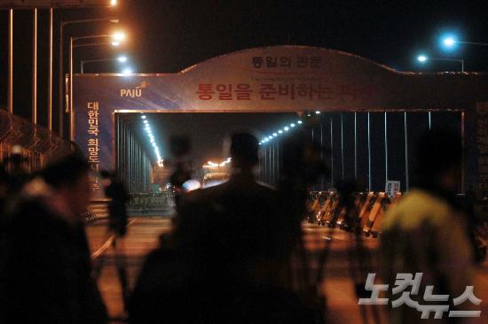 우리 정부의 개성공단 가동 전면중단 조치에 북한이 하루 만에 남측 인원 전원을 추방하고 자산을 전면 동결하는 조치를 취한 지난 11일 저녁 도라산 남북출입국사무소 방향에서 돌아오는 차량들이 통일대교를 건너고 있다. (사진=윤창원 기자)