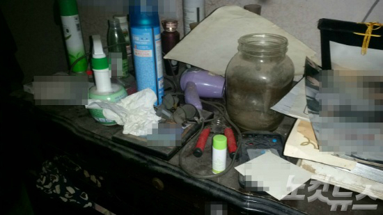 바닥에도 역시 옷가지와 집기류 등 온갖 살림살이와 쓰레기들이 어지럽게 널브러져 있었다.